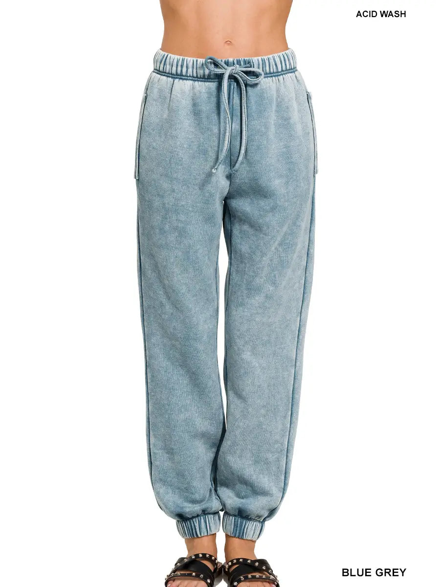 ACID WASH FLEECE SWEATPANTS WITH POCKETS - DRAWSTRING ELASTIC WAIST