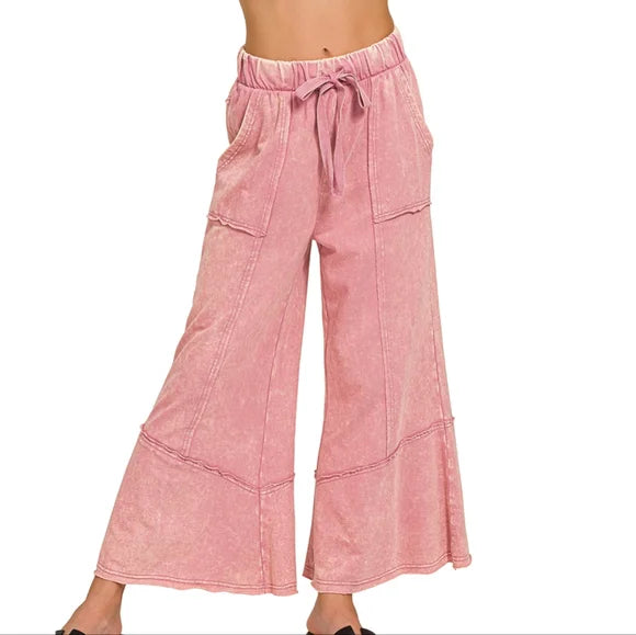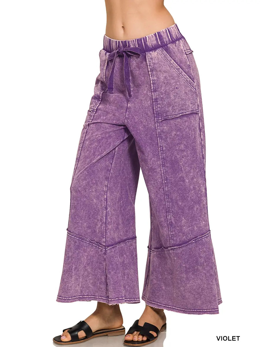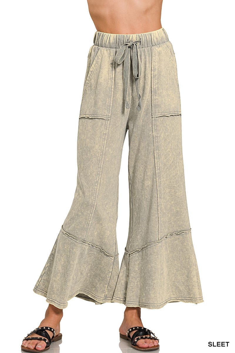 EXPOSED-SEAM FLARE HEM PANTS WITH POCKETS - ACID WASH - DRAWSTRING BAND WAIST - POCKETS - FLARE RAW HEM **Each item is unique, expect variations in color and finishing TOTAL WAIST: 26", INSEAM: 25" approx. - MEASURED FROM SMALL * COLOR MAY VARY SLIGHTLY DUE TO MONITOR RESOLUTION